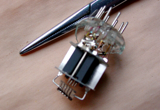 这是颗用于高频放大的通用双三极管6N1。1是吸气剂;2是灯丝阴极和栅极的组合体;3就是阳极。